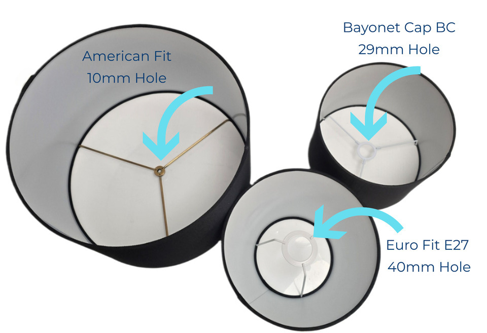 - Euro Harp – Frame with a 40mm diameter hole to sit on an Edison screw lampholder (E27), usually sits approx. 40mm up from the bottom of the shade for table and floor lamps.