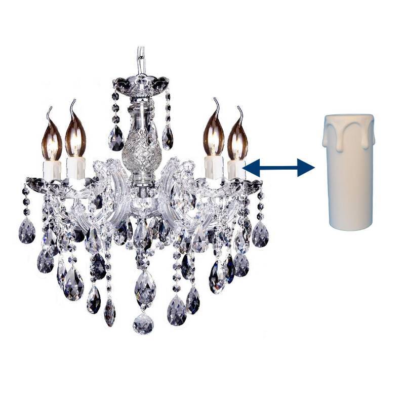 These are usually a plastic sleave with fake dripping candle wax. Due to the heat of the lightbulbs these break down over time. Cracked and broken candle effects can make any chandelier look tired and old. Changing your lightbulbs to LED will make these last twice as long