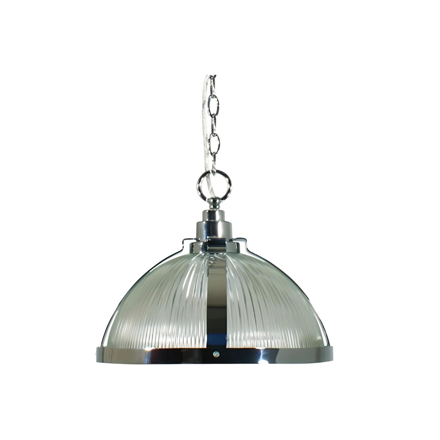 - Clear holophane pleated glass is paired with polished chrome, finished with strong chrome straps and matching chain for a bold, structured look.