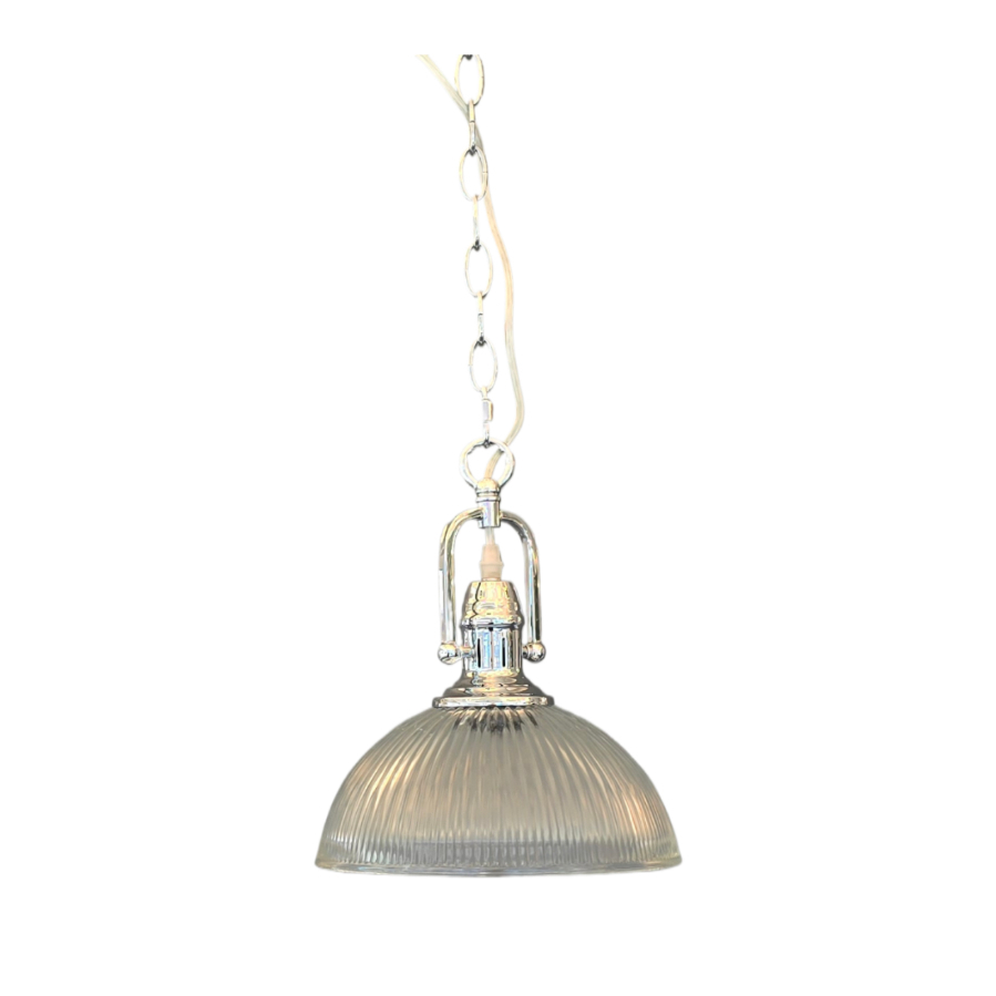 - The detail is in the glass, the clear halophane design is like a pleated glass which diffusers the glare of the naked lightbulb