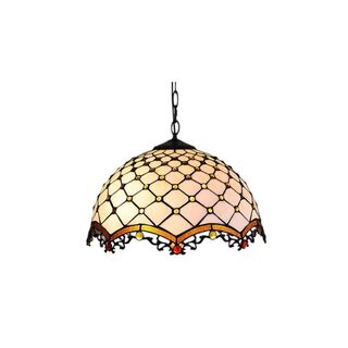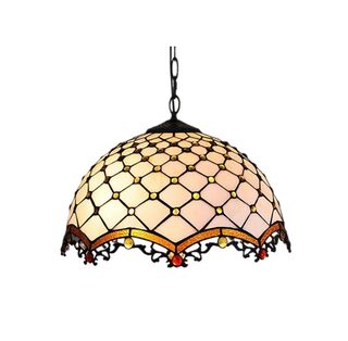 - Stained glass pendant has amber beads and decorative metal lace around bottom edge